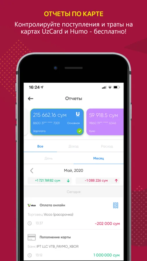 — просматривайте свои расходы и доходы по картам UzCard и Humo бесплатно. Удобный фильтр позволяет быстро найти искомую транзакцию по Вашей банковской карте