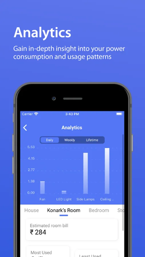 2 - The App also tracks your usage and consumption of electricity via analytics, thereby providing foresight to predict your electricity bill and study your usage patterns thereby helps you to save electricity.