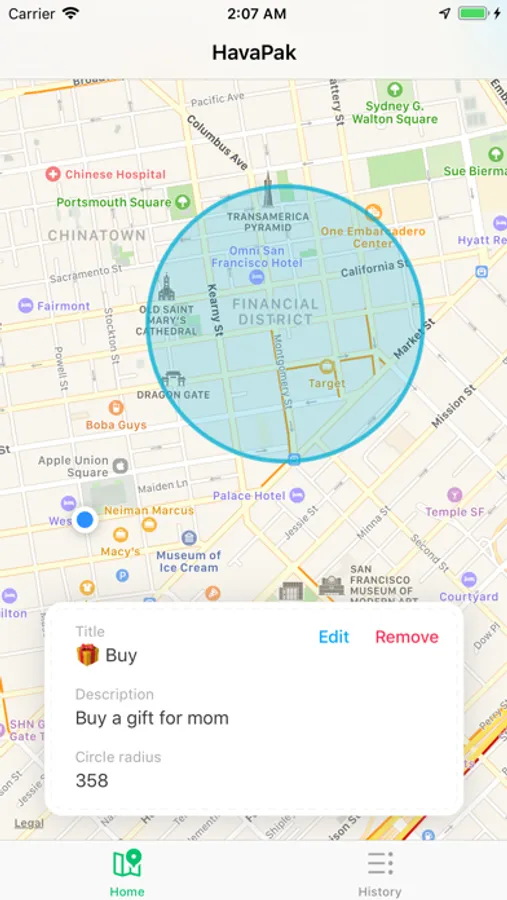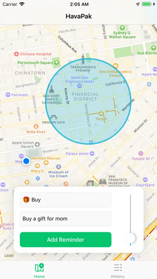 Creating reminder is quite easy, you just press and hold for a second after that, the region of location is added automatically also you can set a title, a description and a circle radius for the reminder, HavaPak send you a custom message as a notification or alert.