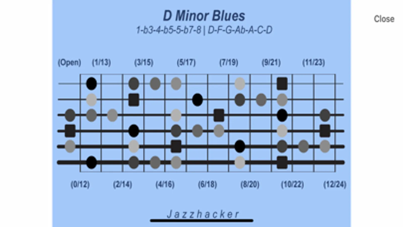Jazzhacker Scales for Guitar (G6) includes 340 6-string guitar scale and mode images, color-coded and featuring stylized fretboards with fret references and note locations, and formula and note references. The user may select an image to view or select a standard slideshow to play, or build a custom slideshow, for practice or study or entertainment. Images and slideshows may be viewed in full-screen mode and run with or without the built-in, adjustable metronome.