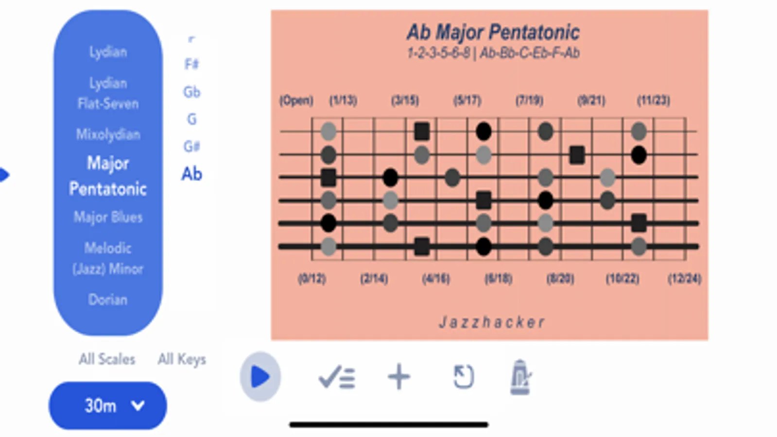 • Play any scale or mode in all keys