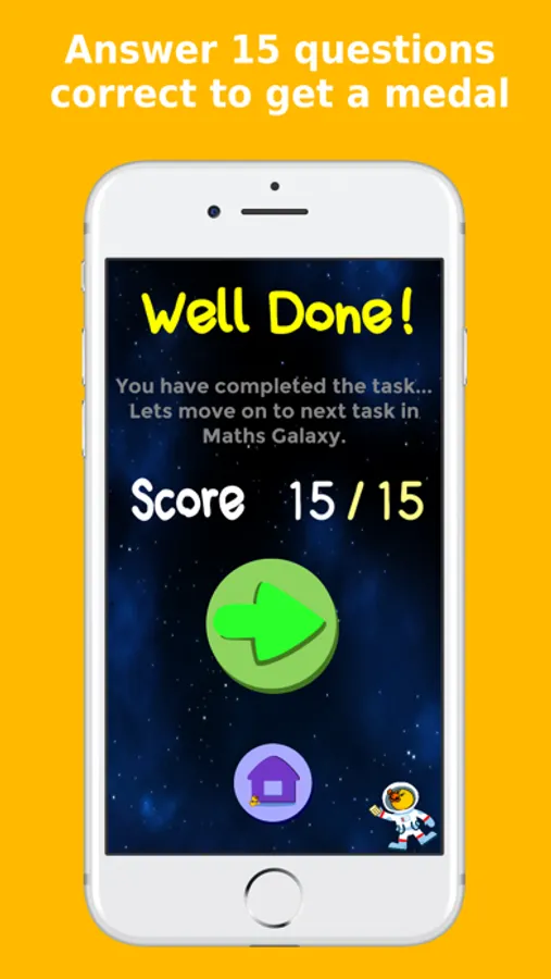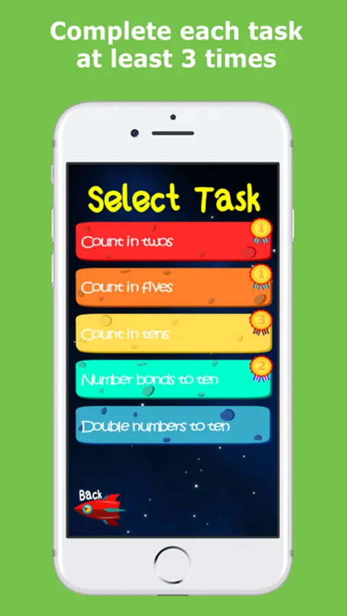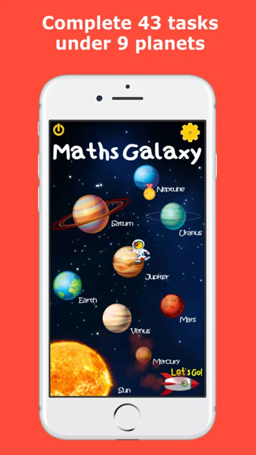 There are 9 planets and 43 different tasks in the Maths Galaxy app. Planets, from Neptune to Sun, represents different levels, which contains various task. We advise to start and complete task respectively starting from Neptune, counting forward and backwards. To get a planet achievement medal every task under the selected planet must be completed at least 3 times. Each time you answer correctly 15 question by heart from the start, you get a task achievement medal 1, 2 or 3. All you need to do is practice more to improve your numeracy skills.