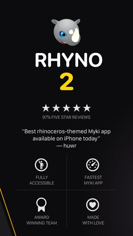 Rhyno is a simple app for checking whether or not your Myki card will allow you to travel on public transport in Melbourne. It's easy to understand and delightful to use. Checking your balance has never been this straightforward or fun!