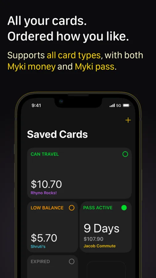 Add your Myki card using NFC, and Rhyno will show its status, be it Myki money or Myki pass. If you add multiple cards, you can assign each one a coloured label to help understand which one is which. Order your cards however you choose, and remove them when they’re no longer needed.