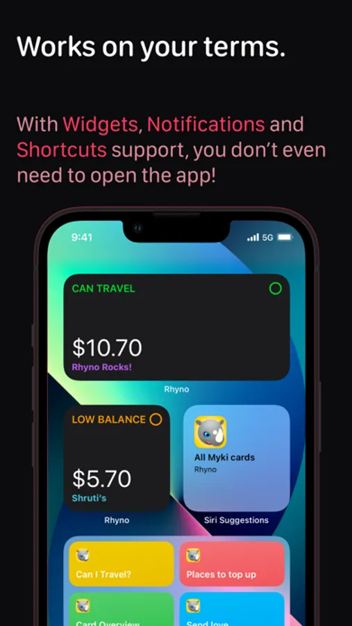 Widgets enable you to glance at your cards’ balances at any moment. If you really want to up the game, you can build your own shortcut in the Shortcuts app using Rhyno's actions.