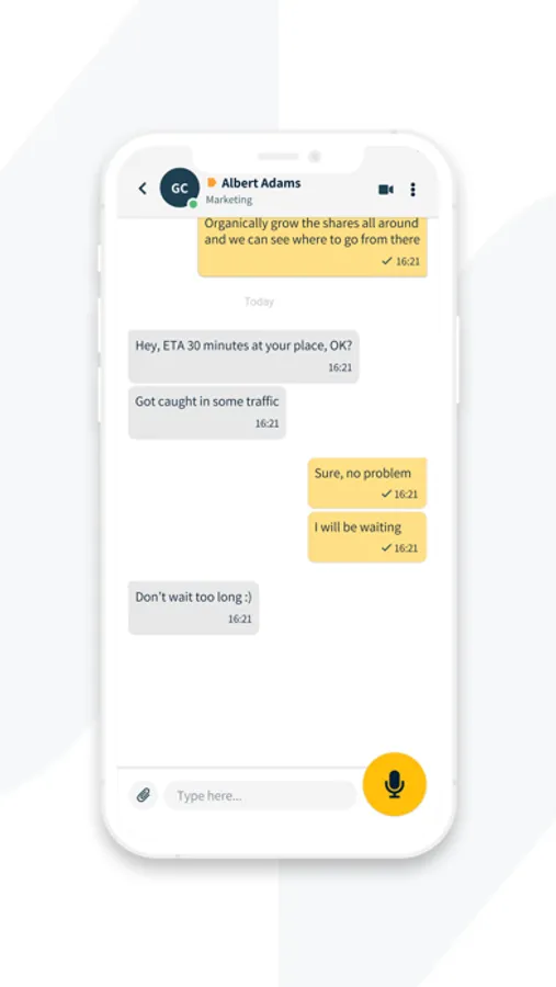 • Organizational Chat - texting, splash messages, voice and video recording in a secured organizational environment.