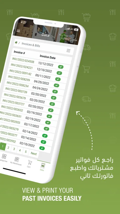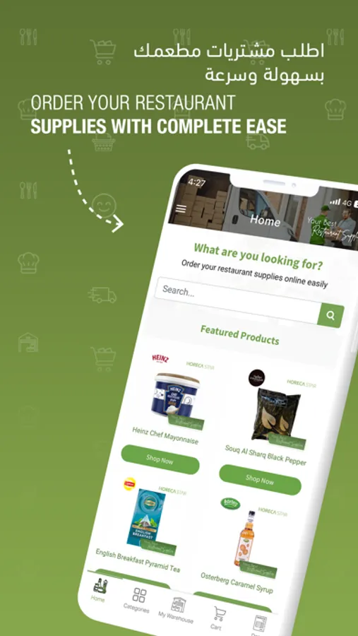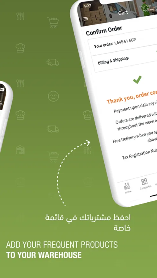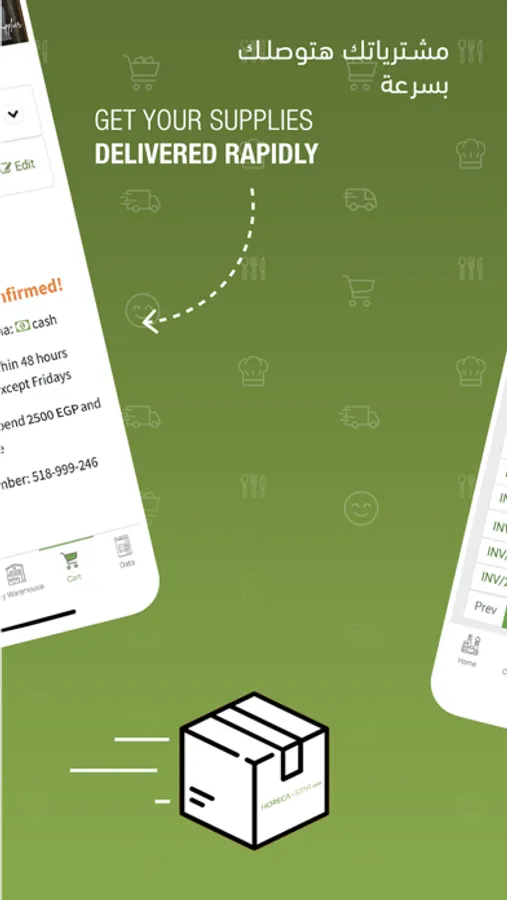 اطلب مشتريات مطعمك من بين مئات المنتجات المتوفرة، نمكنك من متابعة معاملاتك ومشترياتك وفواتيرك سواء تمت أونلاين من خلال الموقع أو الآبليكيشن أو من طرق أخرى (فريق المبيعات، خط دعم العملاء، الواتساب، الإيميل)