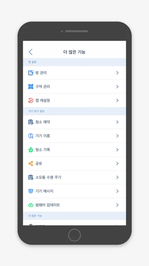 ·장치 위치지정을 통해 로봇이 청소한 영역과 시간의 데이터를 확인할수 있습니다·장치의 이름을 사용자가 원하는대로 설정할수 있으며, 시간 보정, 어플에서 로봇 삭제 등의 기능을 지원합니다