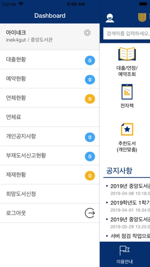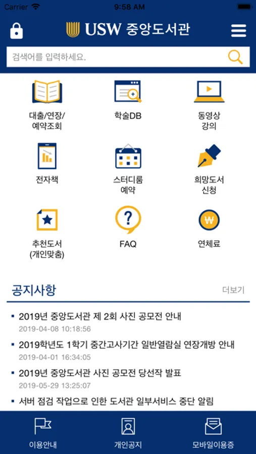 층별안내, 이용안내, 도서관 소개 등의 정보를 제공합니다.