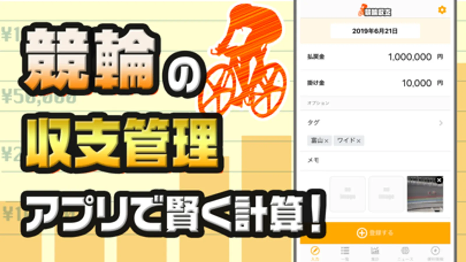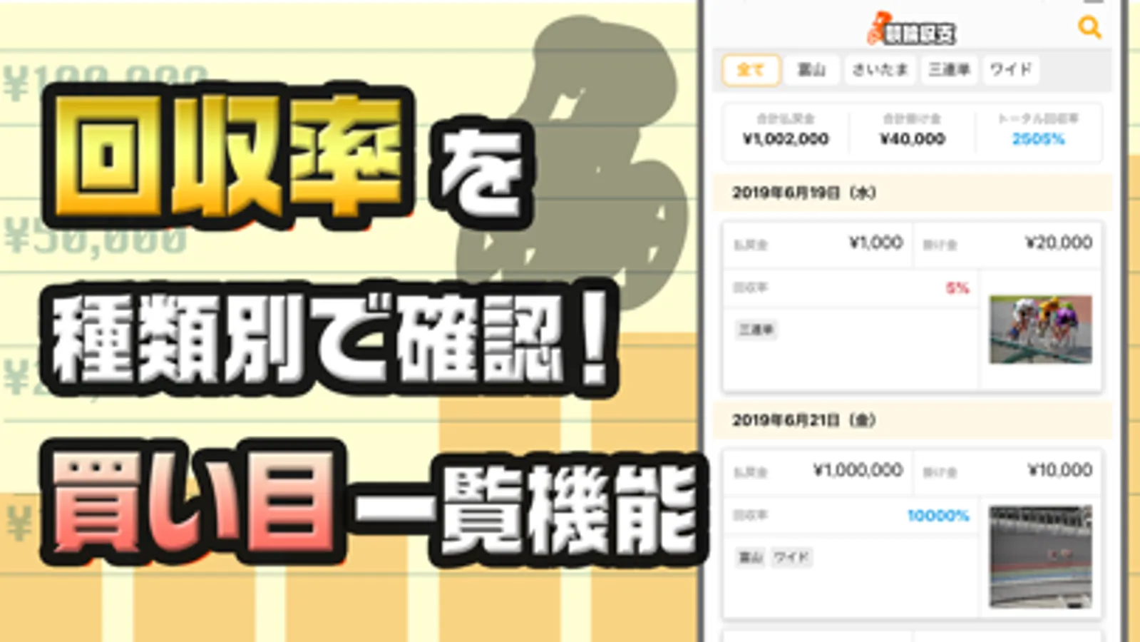 メモや画像の設定はもちろん、タグ付けによって競輪場ごとなどタグ別の収支管理も可能です。