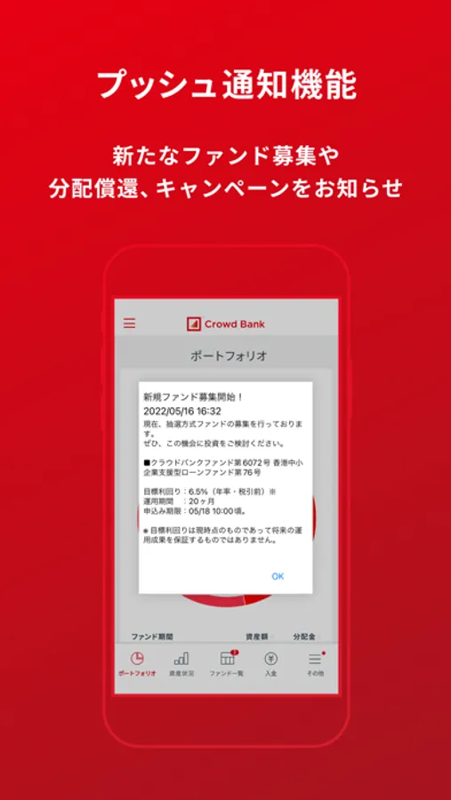 全てのファンドは、保全性を考慮した融資による運用を行うので、相場の値動きを常にチェックして売買を行う必要もなく特別な知識がなくても、「ほったらかしで資産が増えていく」体験を楽しめます。