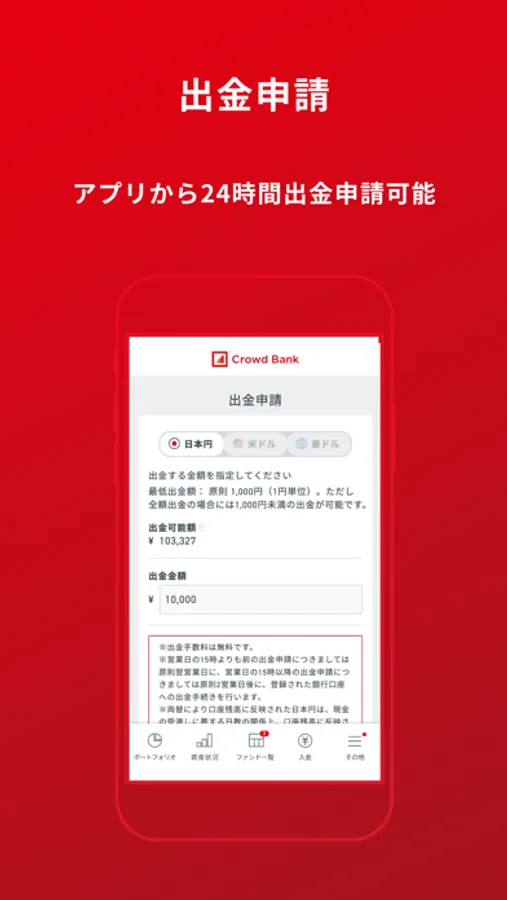 ・口座開設手数料、投資手数料、口座維持手数料、日本円での出金手数料すべて無料