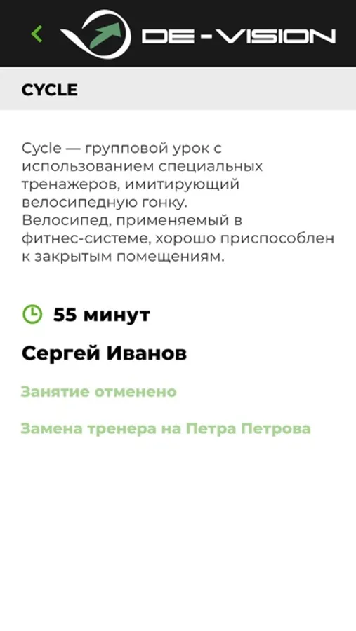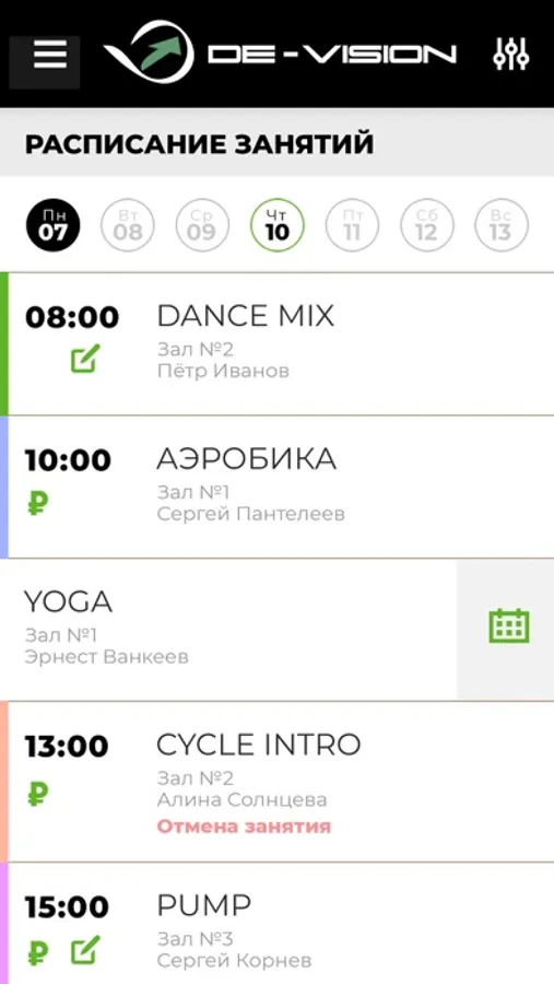 - доступ к актуальному расписанию групповых программ, описанию и продолжительности занятий;