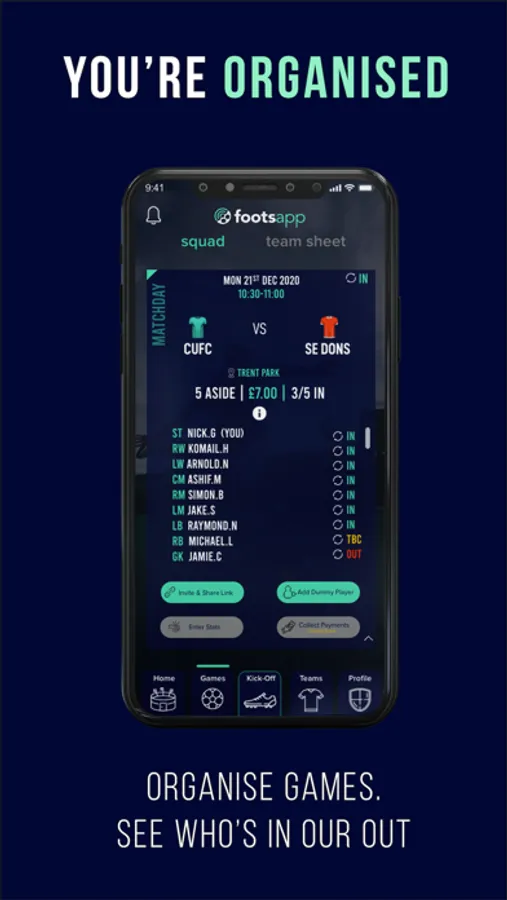 Once you’ve got your team, create a match or session, then invite your teammates with just one click. They’ll confirm their availability with our IN and OUT feature. This stops all the match day hassle of player availability. Clarity with a click.