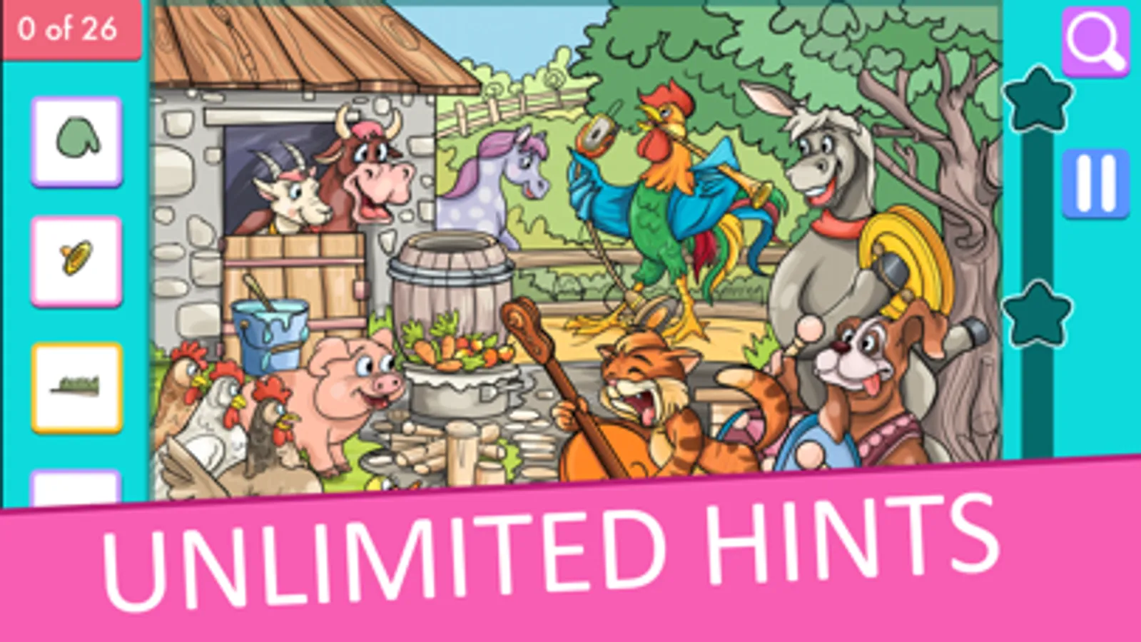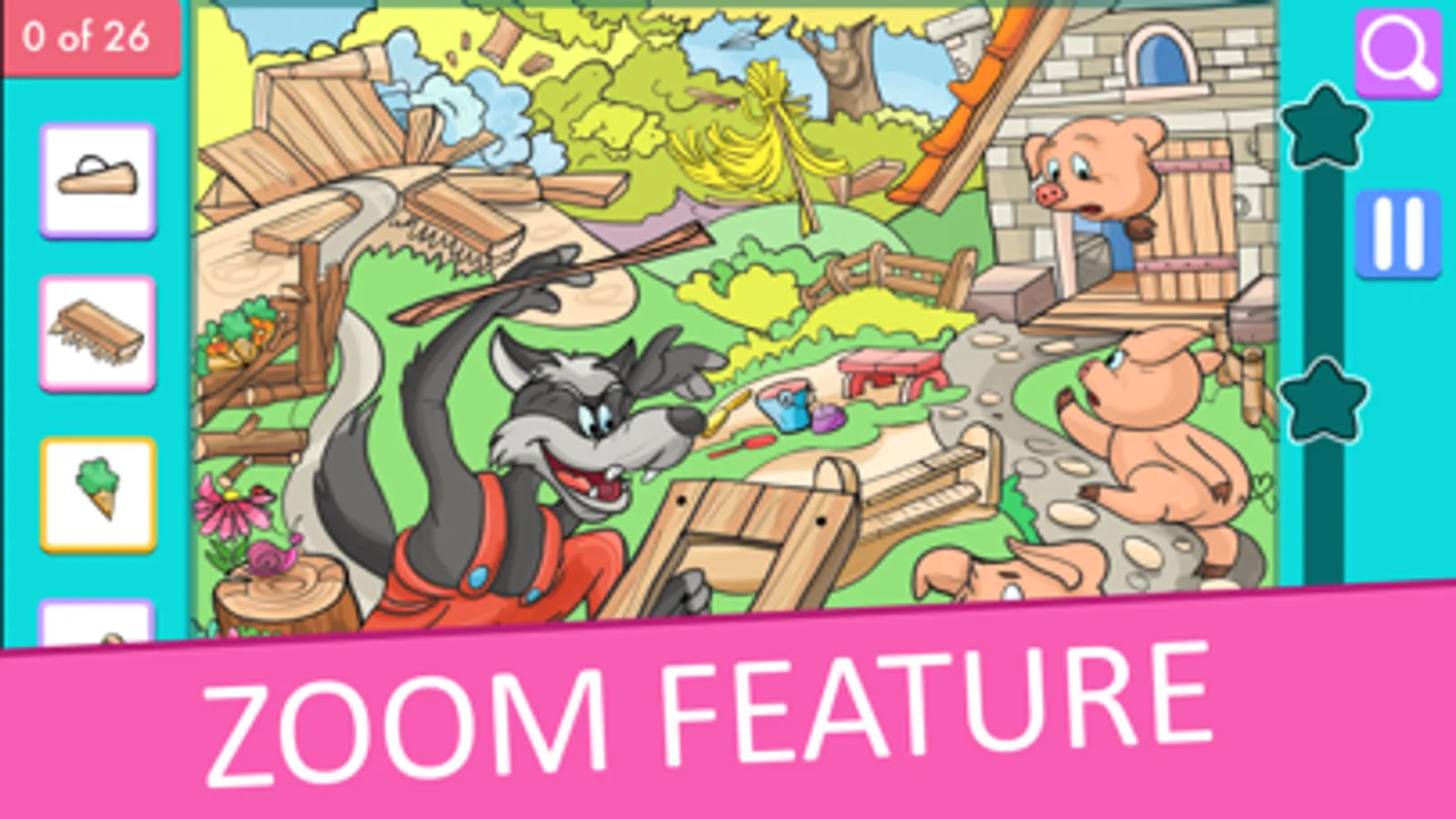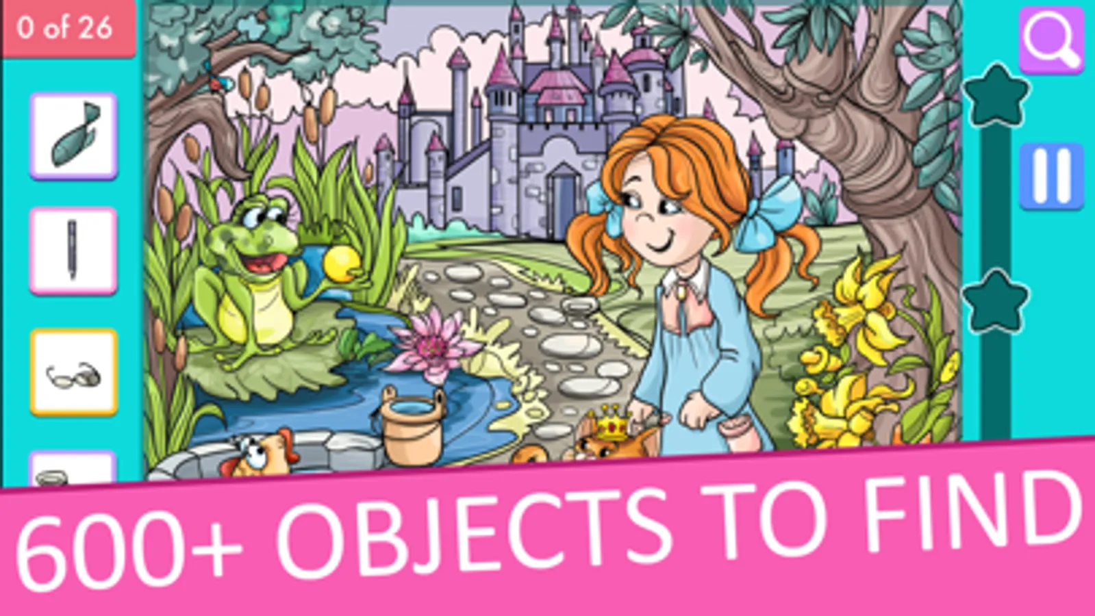 Fairy Tale Hidden Objects will fascinate your kids with wonderful handcrafted graphics in cute cartoon style and interactive fun animated characters!