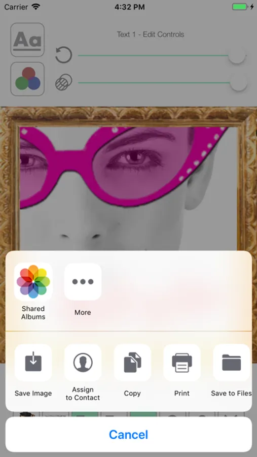 Tap the save button to save design to camera roll, or use a long press gesture on the save button to show the social sharing options and share to social media or message, email, viber etc.
