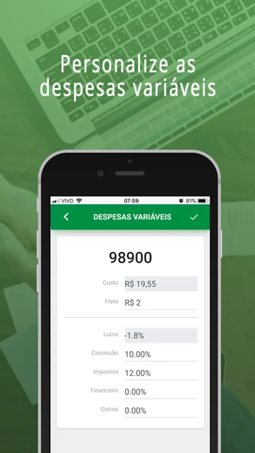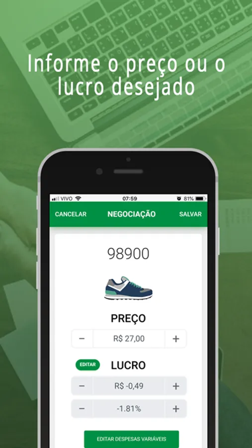 O app Negociador realiza o cálculo do lucro ou preço final e exibe resultados em tempo real, proporcionando ao usuário a segurança de um preço de venda que gere lucro para a empresa.