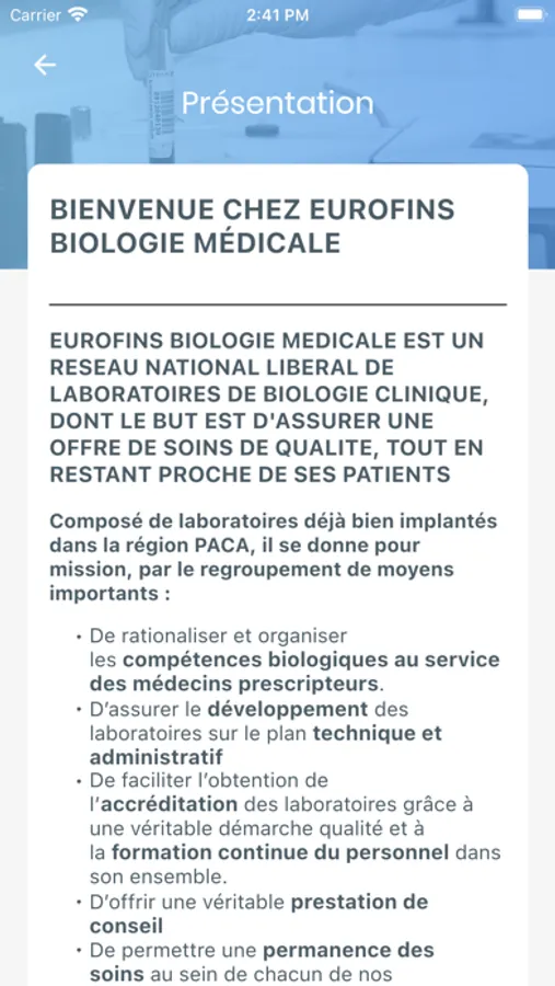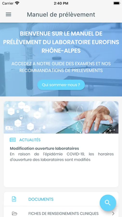 EUROFINS RHONE ALPES est une application médicale ayant pour objectif la mise à disposition d'un manuel de prélèvement à l'usage des professionnels de santé (Infirmiers, Biologistes, Médecins).