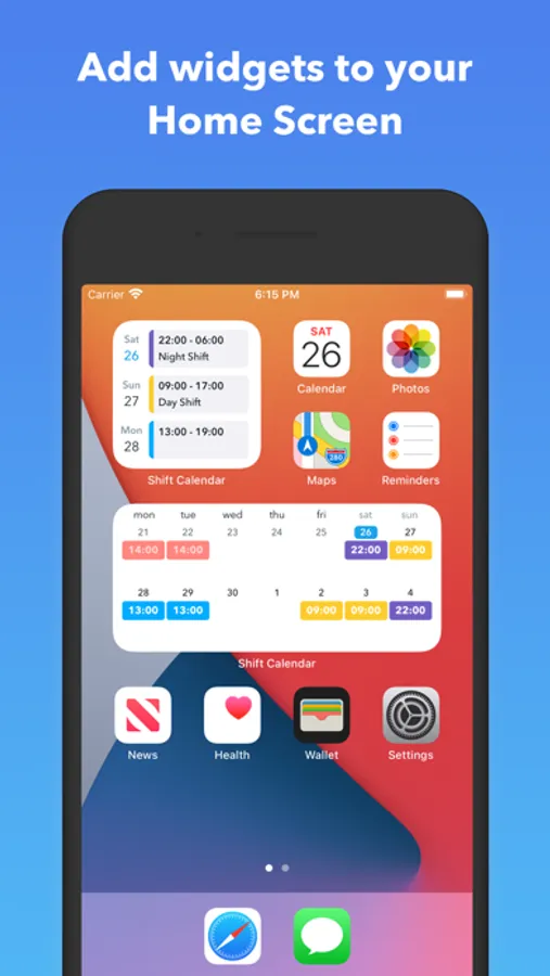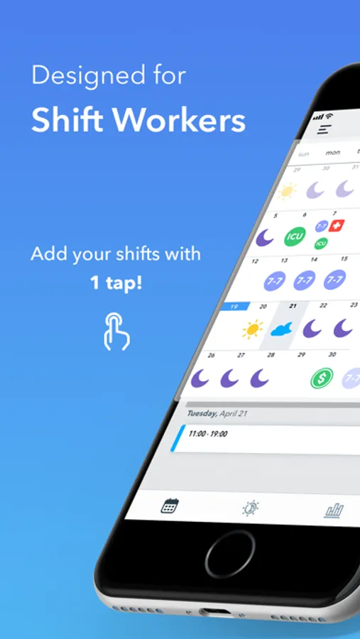 Adding a shift is as simple as tapping on the calendar. An entire month could be filled up in a few seconds. Feel free to customize all the icons with a variety of colors. This way, you can see your schedule without any confusion!