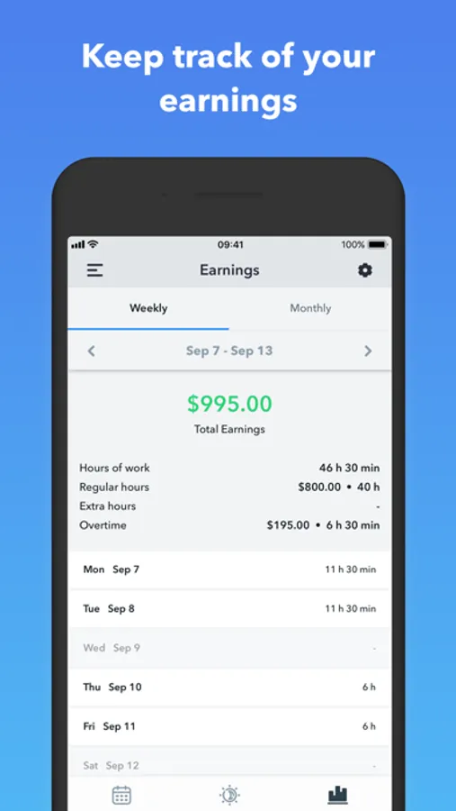 Shift Calendar also helps you track your earnings. You can see the monthly and weekly hours of work time for each day as well as breakdowns of your earnings.