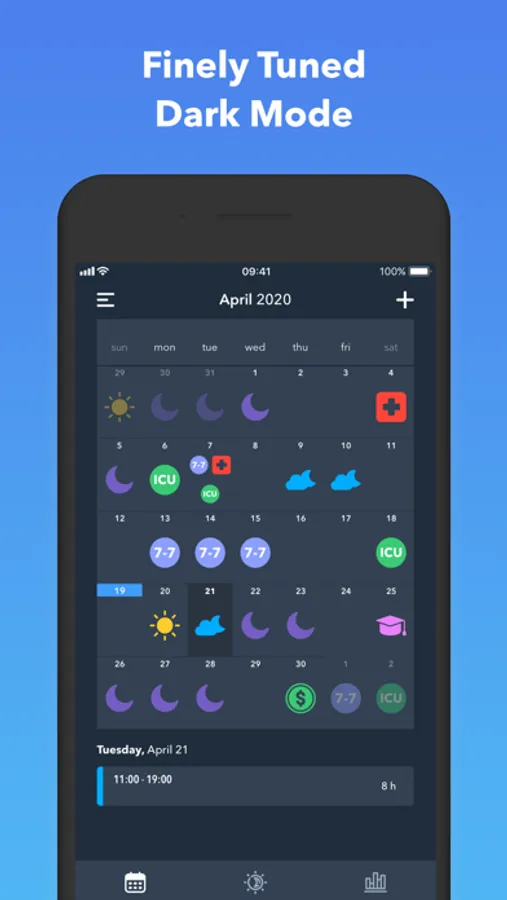 Shift Calendar allows you to export a monthly report as a PDF or spreadsheet. It also comes with a dark mode, complete iCal and iCloud support, today extension widget. All you have to do is to give our app a try and adapt it to your schedule.