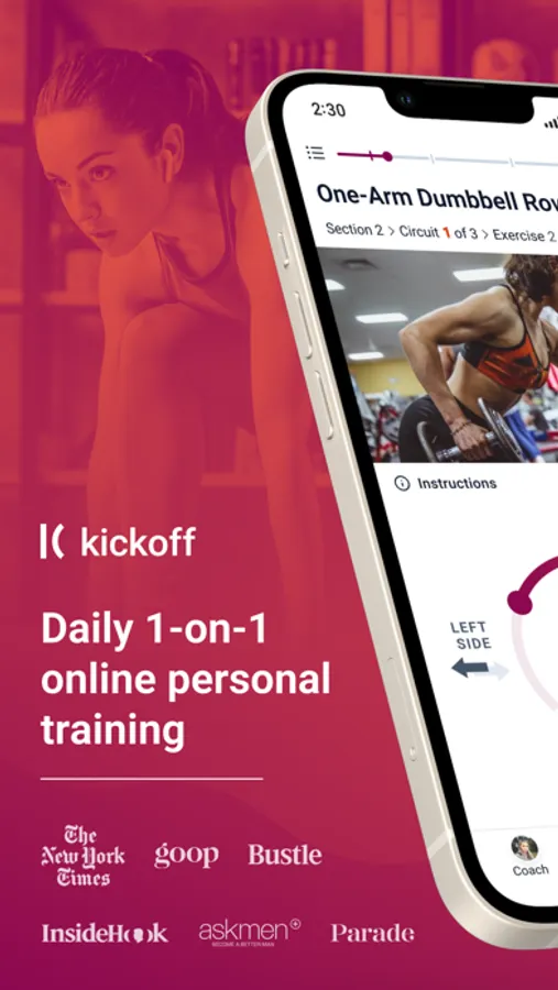 Everyone needs human support and accountability to reach their fitness goals, but traditional personal training services are prohibitively expensive for most of us. Kickoff gives everyone access to all of the benefits of a 1-on-1 relationship with an expert personal trainer at a price that makes sense.