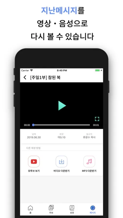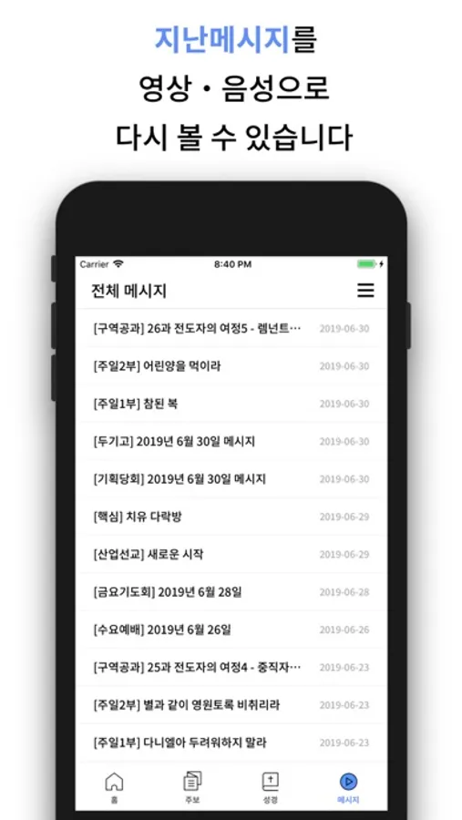 4. 지난 주일 예배 메시지와 수요예배, 산업, 핵심 등의 메시지를 쉽게 볼 수 있습니다.