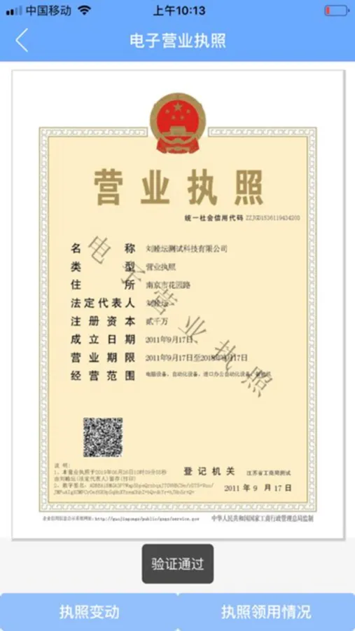 电子营业执照验证功能:提供电子营业执照扫码验证、出示验证等功能。市场经营主体使用电子营业执照办理线上、线下窗口业务时,可分别使用“扫一扫”、“出示执照”功能,对电子营业执照真实性、有效性等进行验证。
