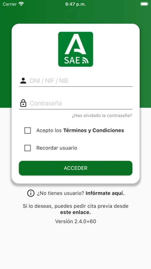 Para acceder a la aplicación la persona debe instalarla en su dispositivo móvil y utilizar sus credenciales (Clave y PIN) para identificarse. Estas credenciales son facilitadas por el Servicio Andaluz de Empleo como institución responsable de confirmar la identidad de la persona.