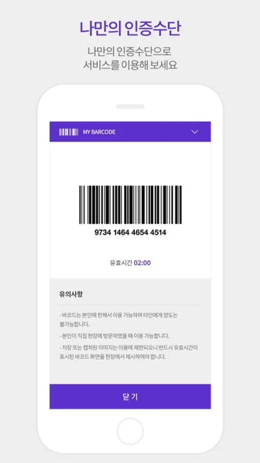 또한 나만의 인증 수단인 바코드를 통해 스마트폰만 있으면 오프라인 현장에서 서비스를 이용 할 수 있습니다.