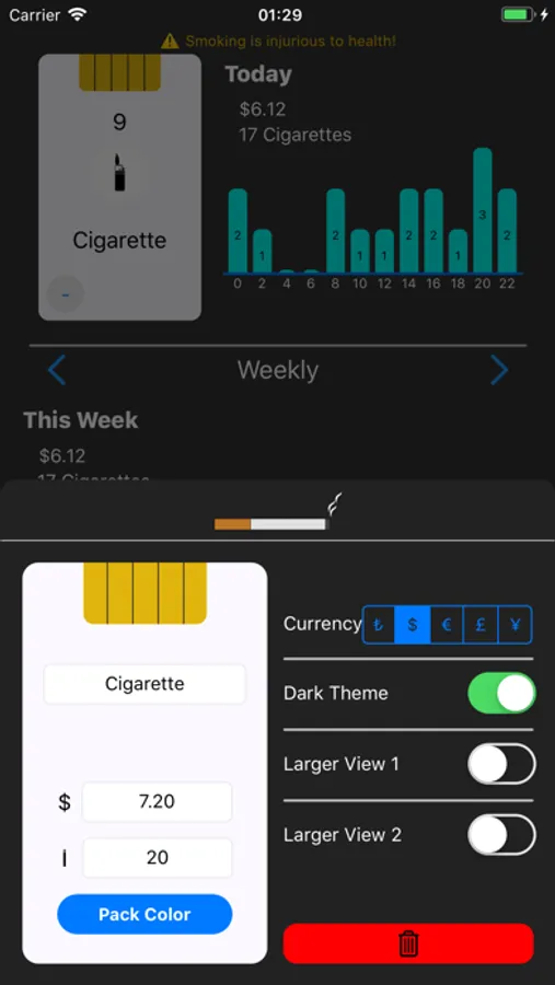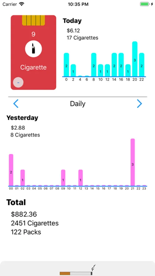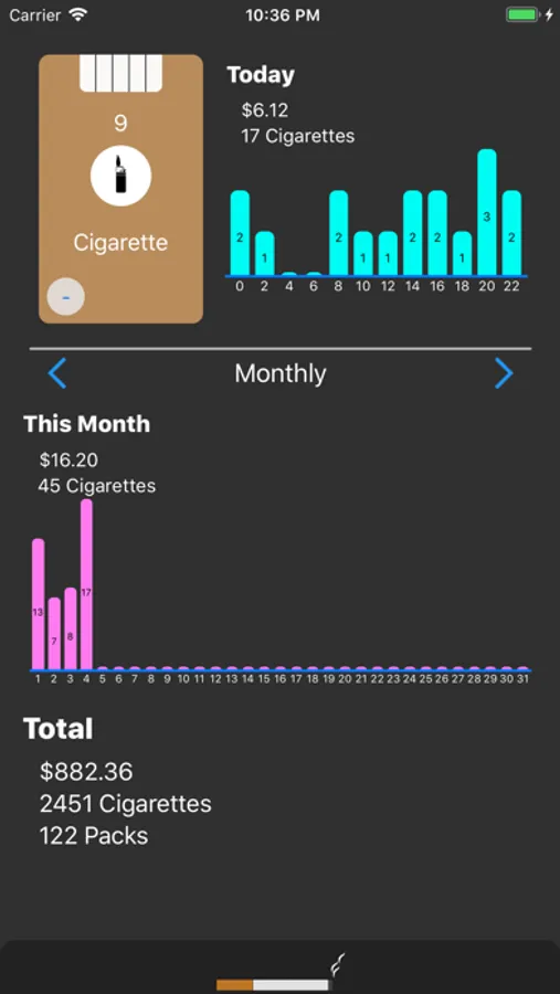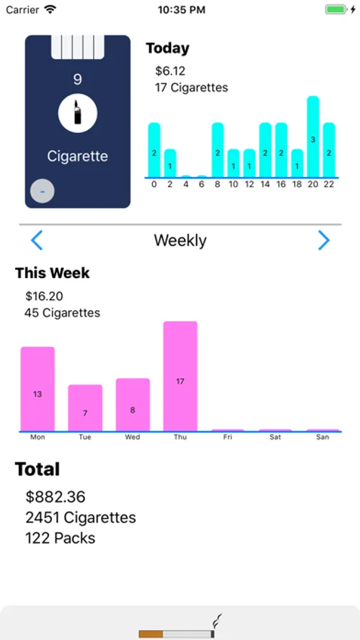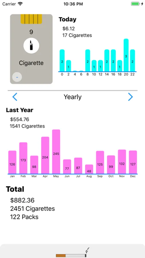 You can easily track your smoking habit, keep it under control and reduce it with this app. You can see how many cigarettes you smoke, how much money you spend, and how many packs you consume during the app using period. The easiest way to quitting smoking is keeping under control, and the easiest way to keeping something under control is by keeping track and visualizing.