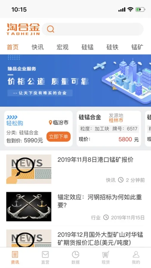 资讯:淘合金平台拥有一支专业的行业分析团队,为上下游企业和个人提供最新最有效的铁合金相关资讯。并且资讯页面也可以看到我们最新的直营商品的报价,并且有轻松购的入口。资讯分为长篇的普通资讯,和短片的快讯。