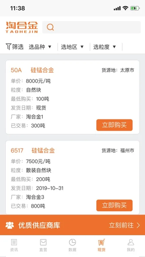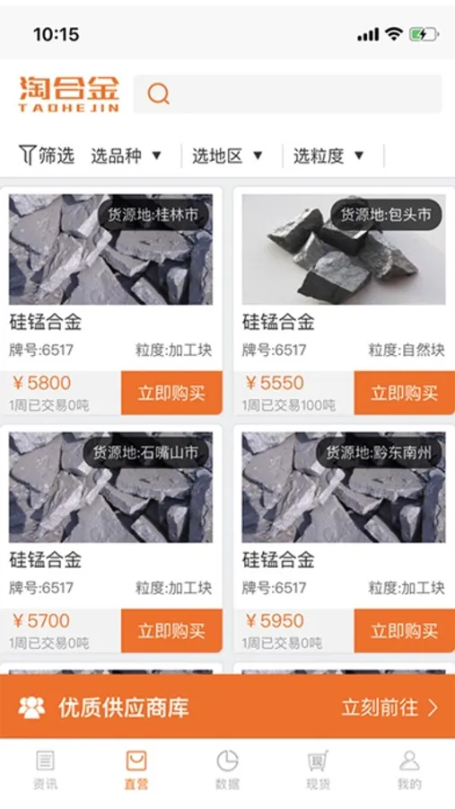 直营商城:淘合金是一家贸易与网络一体的公司,有这大量的铁合金现货资源和贸易经验,直营商城上的商品是我们淘合金直接销售给用户,用户只需要在平台上下单,我们的客服人员就会与用户对接签约合同,并且所有的流程动态都会展示在淘合金app的直营订单详情中,包括合同签订情况,物流情况,货物到场情况,淘合金平台为钢铁公司和贸易商提供价格公道、质量有保障、供货效率极高的铁合金货源。