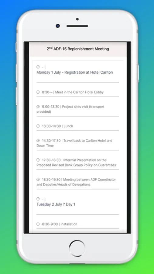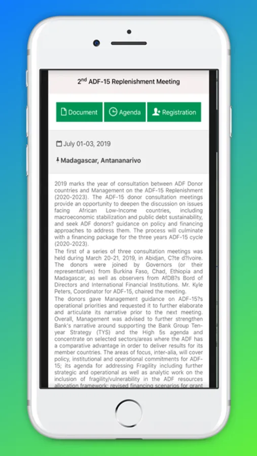 The African Development Fund’s Mobile Application provides information related to the Fund’s activities in African Low-Income countries, as well as the list of recipient countries. The application enables online registration to the African Development Fund’s meetings (ADF MTR and ADF replenishment). For each meeting, user’s will have access to all related documents. Finally, for authorized users, access to the Matrix of commitment will be granted to share the information about the status of commitment by complex and their outcomes.