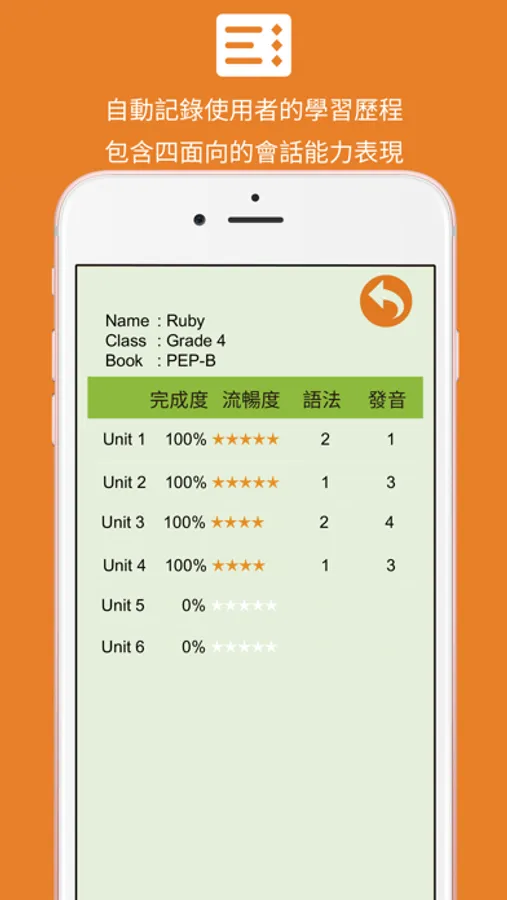 對話進行當中,系統自動記錄使用者的學習歷程,包含四個面向(流暢度、完成度、語法、發音),讓您清楚看到努力的成果