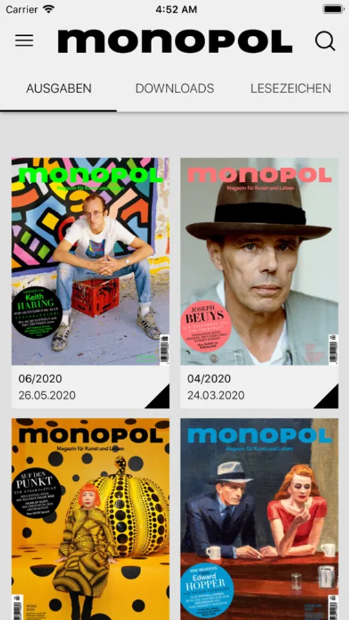 Monopol, Magazin für Kunst und Leben, ist das Magazin für zeitgenössische Kunst in Deutschland. Seit 2004 präsentiert das innovative Kunst- und Lifestyle-Magazin jeden Monat die aktuellen Themen des nationalen und internationalen Kunstbetriebes. Monopol schaut hinter die Kulissen der zeitgenössischen Kunst, porträtiert die wichtigsten Akteure, analysiert den Kunstmarkt und entfacht kritische Debatten. Auf hohem Niveau nimmt es Architektur und Design, Mode und Stil in den Blick.