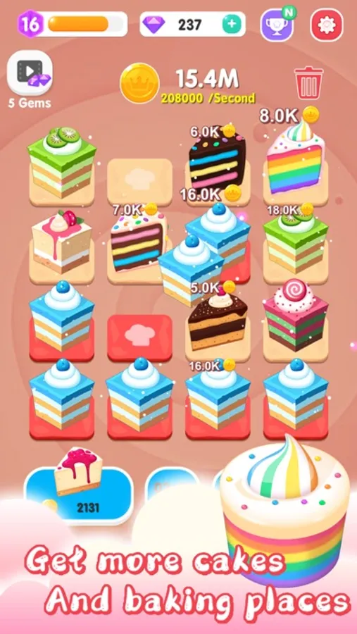 All cakes in plate will get incoming automatically. You need to merge them to get more incoming. And then you are on your way to build your baking empire now. Remember to fill all the plates with cakes! Unlock all kinds of cakes now, build your own baking store and become idle baking tycoon!