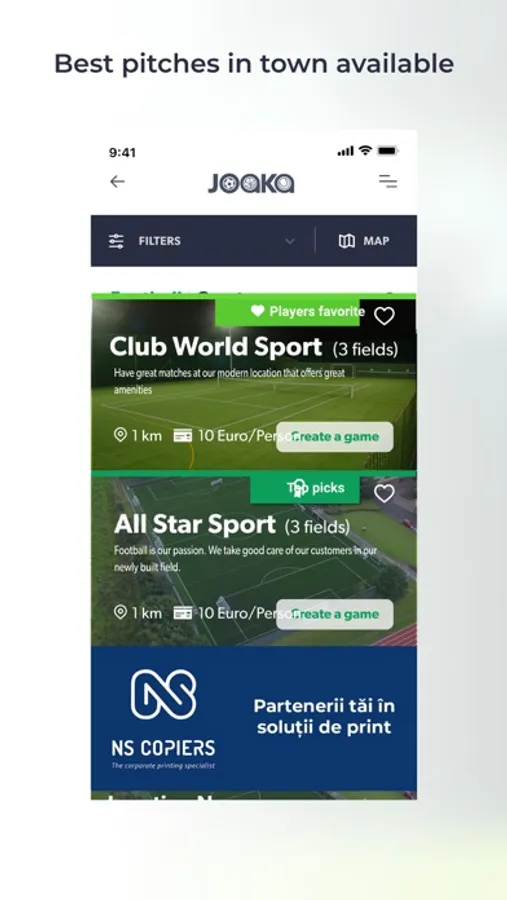 Fie că vrei să joci un joc de tenis sau să ieși cu gașca la fotbal, avem soluția pentru voi. Alegeți terenuri din peste 7 orașe din România - Descarcă aplicația și haide să jucăm!