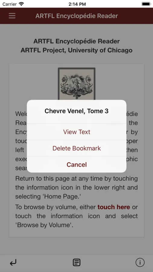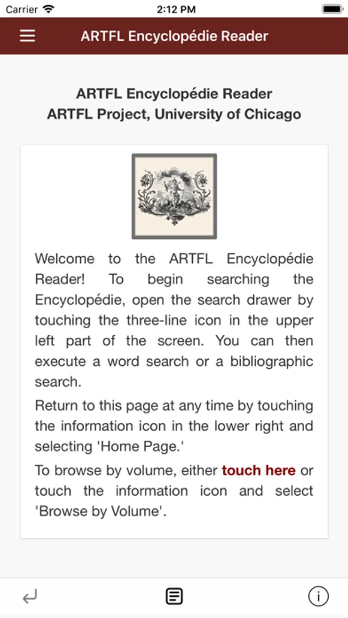 To browse tables of contents of volumes, either touch the highlighted "touch here" link on the home page or touch the information icon in the lower right of the screen and select "Browse by Volume."