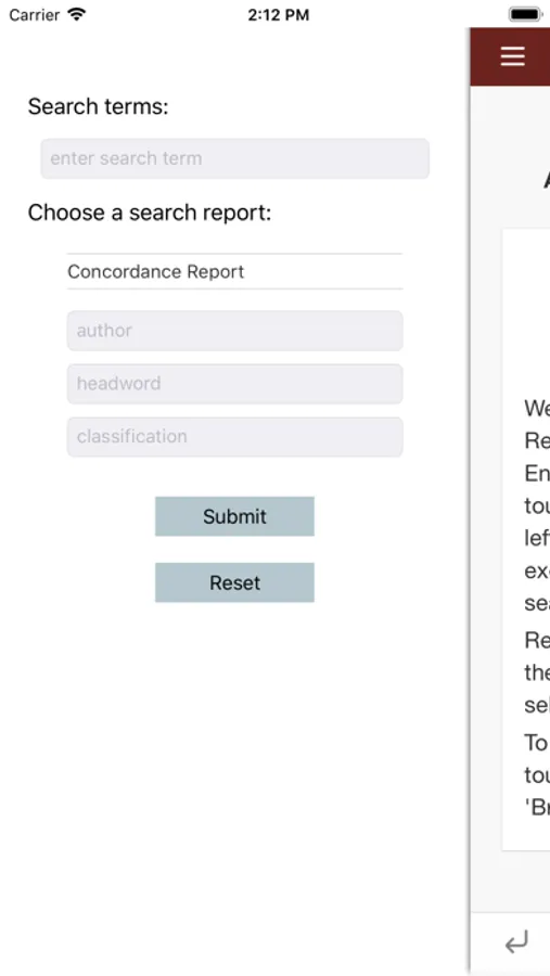 To generate a word frequency report by various bibliographic parameters, scroll through the picker menu under "Choose a search report". Results will display in a complete list. Touch links to retrieve a concordance report for the individual frequency results.
