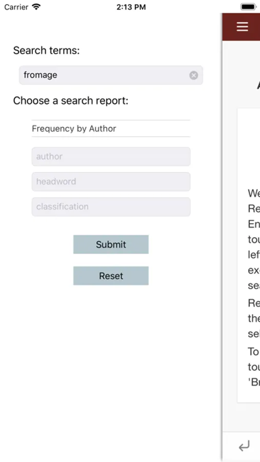 To search or retrieve texts, touch the three line icon on the left side of the Navigation Bar. A search form drawer will toggle on the left side of the screen. To search for occurrences of a word in the database, fill in the "Search terms" field. Search terms are not accent sensitive: for example, entering "eclat" will return all instances of "éclat". Note also that wildcard characters will expand search terms. For example, "amour.*" will retrieve instances of "amour," "amoureux," "amoureusement," etc.