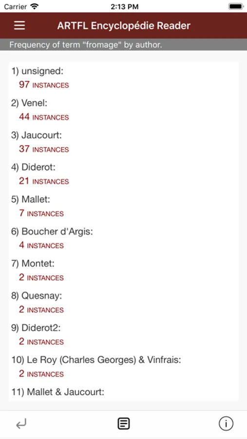 The ARTFL Encyclopédie Reader app is a text search and retrieval interface that interacts with a fulltext-searchable version of the Encyclopédie of Diderot and d'Alembert running on the ARTFL Project's servers at the University of Chicago. Users can do simple word or bibliographic searches and, from search results, link to larger text sections.