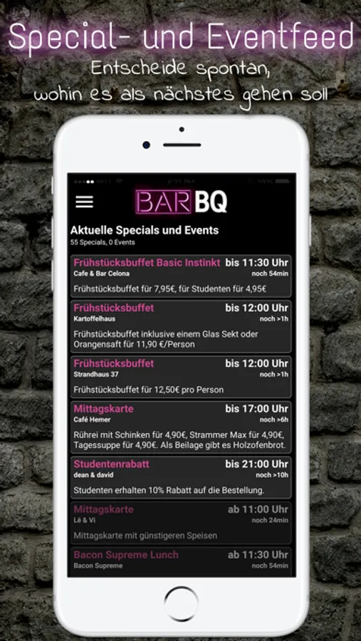 - Mit dem Special- und Eventfeed lässt es sich noch einfacher von Bar zu Bar hoppen, denn du hast direkten Überblick darüber, wo gerade etwas los ist.