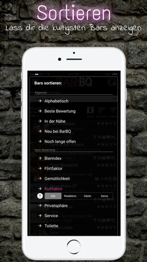 - Sortiere nach Entfernung, Öffnungszeiten oder einzelnen Bewertungskriterien wie z.B. Flirtfaktor oder Gemütlichkeit.