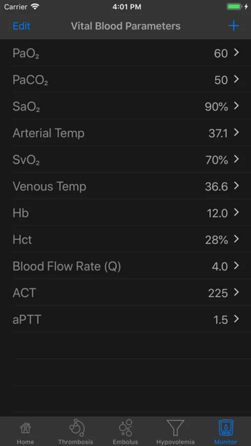 Display simulated vital blood parameters PaO2, PaCO2, SaO2, SvO2, Hb, Hct, Arterial Temperature, Venous Temperature, Blood Flow Rate, ACT, TEG, aPTT, pH, P1, P2, Anti-Xa, FiO2, Lactate, Sweep Gas, ABP, PAP, CVP, and PWP (Wedge Pressure)