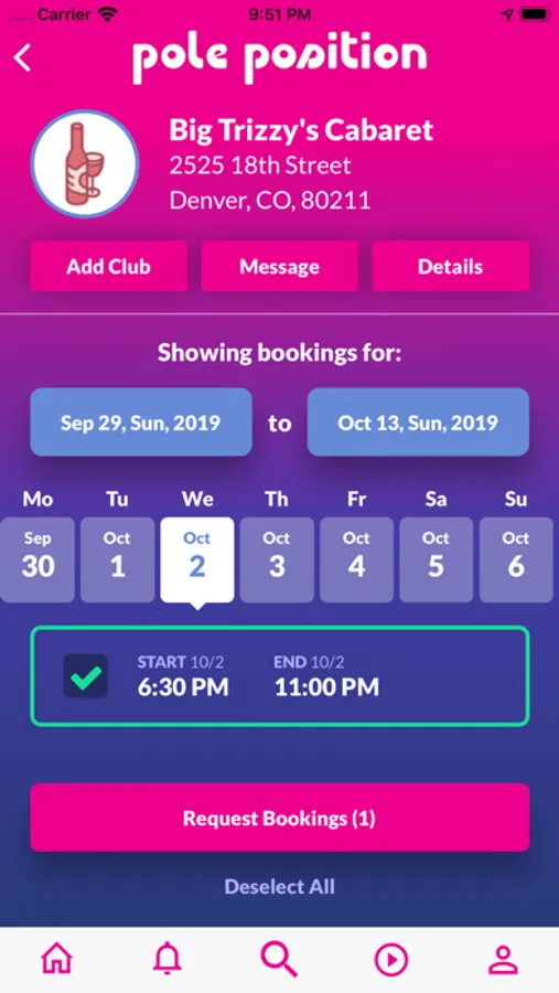 Using Pole Position, dancers can search by city for clubs and apply for any open bookings the club wishes to fill. Search for venues by music choice, food options, and any number of filters to find the right match for your optimal experience.
