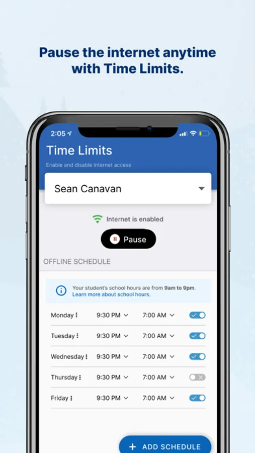 -Pause internet access on-demand or at a scheduled time on school-issued devices during out-of-school hours