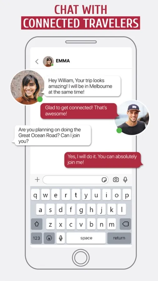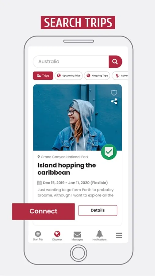 Search for your desired destination. When you like a trip, hit ‘Connect’ and start chatting instantly.