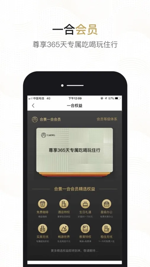 可在一合APP上领取到C22免费咖啡、木莲庄酒店免费升房、目林联合办公免费体验、昕舍长租公寓租住折扣、合景泰富地产购房折扣、旅游满减礼包、教育满减礼包等30余项会员权益,覆盖合景泰富旗下所有业态