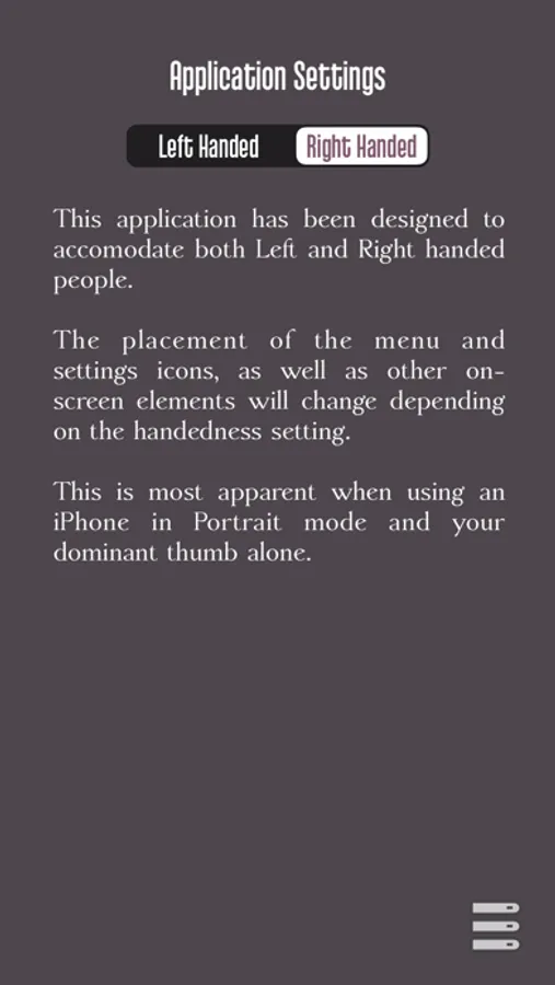 We support Left and Right handed modes, with all the primary buttons available comfortably within the sweep of your dominant thumb, as well as the ability to dynamically re-order the menu system to put what you need, where you need it most; and these settings are always automatically saved and changeable at any time without having to find buried settings or options.